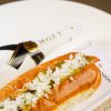 Pan Brioche con Salchicha alemana, Pepinillos, Cebolla crocante, cebolla fresca, salsa de la casa y Cebollín chino.